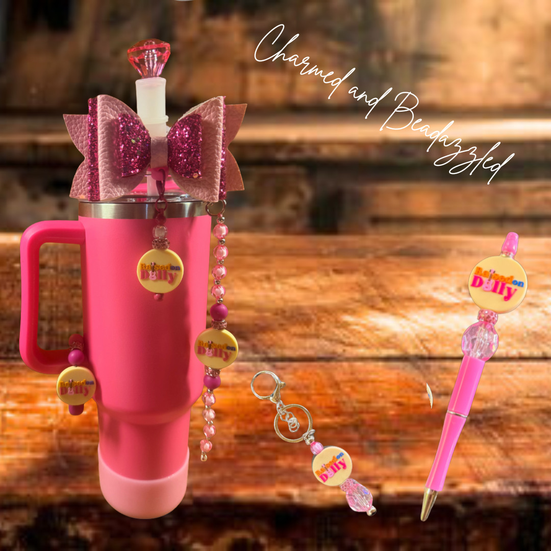 Set Includes: Straw Topper, Straw Bow, Straw Charm, Handle Charm, Tumbler Boot, Pen, and Keychain/Bag Charm. Does not include bracelet stack or tumbler.