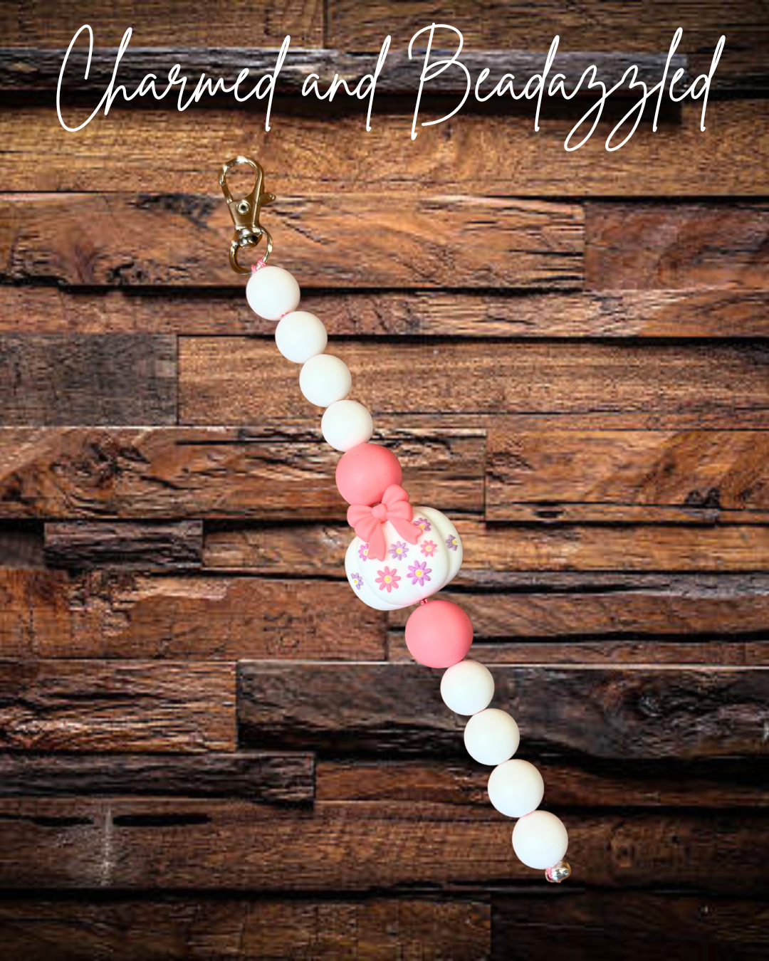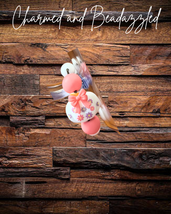 Set includes straw topper, straw charm, large bow charm, handle charm, tumbler boot, keychain/bag charm and pen.