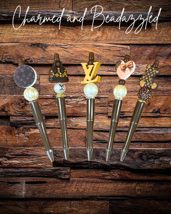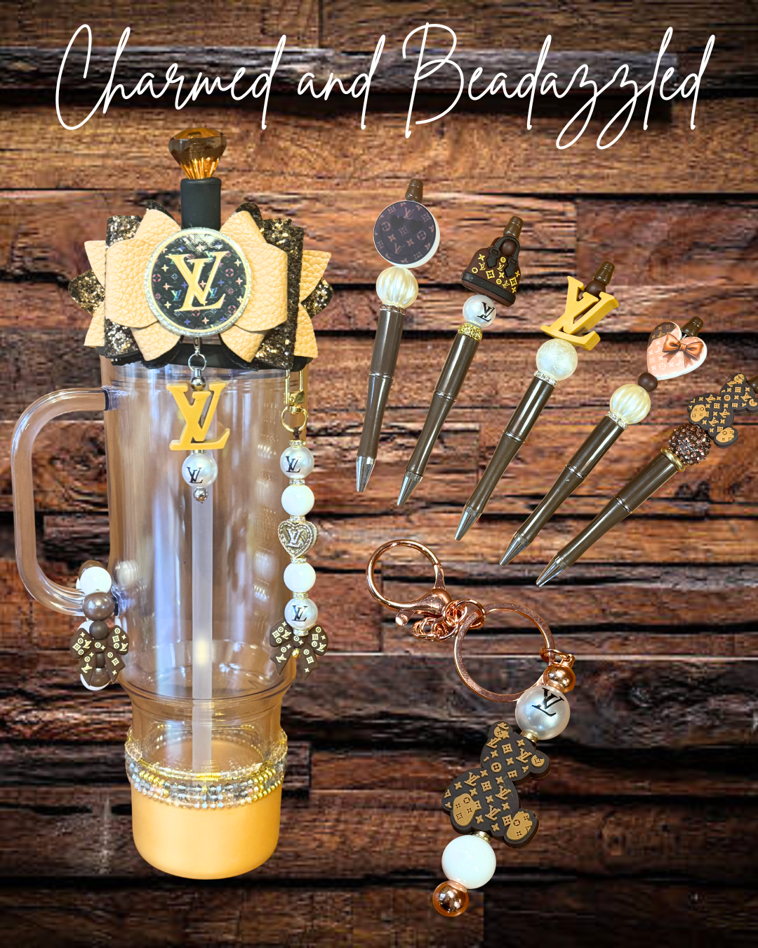 Set includes straw topper, straw charm, large bow charm, handle charm, tumbler boot, keychain/bag charm and pen.