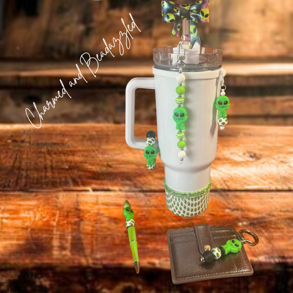 🚀✨ Get ready for an out-of-this-world experience with our Alien Invasion Collection! 🌌👽 This awesome set of tumbler accessories includes a fun Straw Bow, eye-catching Straw Topper, playful Straw Charm, trendy Handle Charm, unique Dangle, stylish Bracelet Stack, protective Tumbler Boot, handy Pen, and a versatile Wallet/Keychain. (Note: tumbler not included.) Transform your tumbler into a cosmic accessory! 🌠🥤