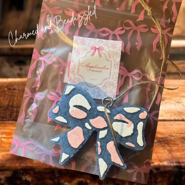 Introducing the Blue and Pink Bow Freshie in Marshmallow Fireside scent! It's perfect for the car or any small space that needs a touch of fall. The aroma is warm and inviting, making every drive feel like a cozy autumn afternoon. Add a Freshie hanger for easy placement!